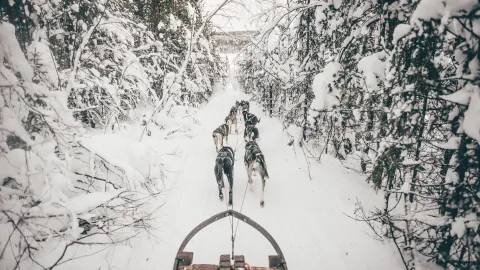 På morgonen promenerar ni den korta biten, över den knastrande snön, till restaurangen och den uppdukade frukosten. Ta er tid och gör er redo för dagens – och kanske resans – höjdpunkt: en hundspannstur genom vinterlandskapet!